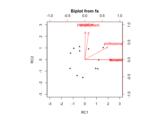data(Harman.5) if(require('GPArotation')){ pc2 <- principal(Harman.5,2,scores=TRUE) pc2$residual biplot(pc2,main="Biplot of the Harman 5 socio-demographic variables") }