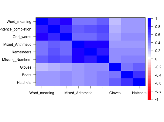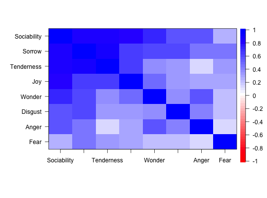 cor.plot(Harman.Burt)#> Warning: Matrix was not positive definite, smoothing was done#> Sociability Sorrow Tenderness Joy Wonder Disgust #> 1.0000000 1.0000000 1.0000000 1.0000000 1.0000000 1.0000000 #> Anger Fear #> 1.0000000 0.9987481