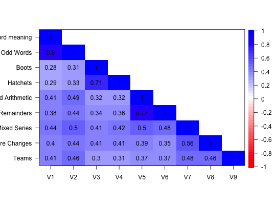 The format is: num [1:9, 1:9] 1 0.8 0.28 0.29 0.41 0.38 0.44 0.4 0.41 0.8 ... - attr(*, "dimnames")=List of 2 ..$ :1] "Word meaning" "Odd Words" "Boots" "Hatchets" ... ..$ : chr [1:9] "V1" "V2" "V3" "V4" ...