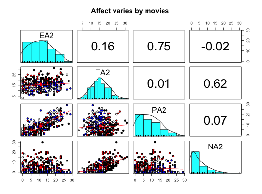 #> #> Descriptive statistics by group #> group: 1 #> vars n mean sd median trimmed mad min max range skew kurtosis #> Film 1 83 1.00 0.00 1.0 1.00 0.00 1 1 0 NaN NaN #> ext 2 83 13.40 4.35 13.0 13.43 4.45 2 22 20 -0.06 -0.58 #> neur 3 83 10.21 4.90 11.0 10.17 5.93 1 22 21 0.06 -0.76 #> imp 4 83 4.34 1.97 4.0 4.30 1.48 0 9 9 0.10 -0.54 #> soc 5 83 7.64 2.77 8.0 7.78 2.97 0 13 13 -0.42 -0.53 #> lie 6 83 2.36 1.50 2.0 2.30 1.48 0 7 7 0.42 -0.14 #> traitanx 7 83 39.91 9.60 39.0 39.55 10.38 23 61 38 0.31 -0.81 #> state1 8 83 39.81 10.75 38.0 39.22 10.38 20 69 49 0.56 -0.17 #> EA1 9 83 9.27 7.21 8.0 8.70 7.41 0 29 29 0.59 -0.48 #> TA1 10 83 12.49 4.80 12.9 12.35 4.30 0 26 26 0.37 0.74 #> PA1 11 83 9.46 7.28 7.5 8.77 5.19 0 29 29 0.80 -0.14 #> NA1 12 83 3.50 3.73 2.0 2.94 2.97 0 17 17 1.41 1.90 #> EA2 13 83 10.02 6.09 9.0 9.72 7.41 0 23 23 0.30 -0.60 #> TA2 14 83 17.48 4.74 18.0 17.55 4.45 8 27 19 -0.20 -0.77 #> PA2 15 83 7.27 5.93 6.0 6.63 5.93 0 23 23 0.78 -0.25 #> NA2 16 83 8.67 5.35 8.0 8.21 5.93 0 22 22 0.60 -0.43 #> state2 17 41 48.66 11.00 49.0 49.21 10.38 20 71 51 -0.45 0.01 #> MEQ 18 41 38.39 11.49 40.0 38.00 13.34 16 65 49 0.26 -0.40 #> BDI 19 42 10.69 6.73 11.0 10.59 7.41 0 23 23 0.05 -1.25 #> se #> Film 0.00 #> ext 0.48 #> neur 0.54 #> imp 0.22 #> soc 0.30 #> lie 0.16 #> traitanx 1.05 #> state1 1.18 #> EA1 0.79 #> TA1 0.53 #> PA1 0.80 #> NA1 0.41 #> EA2 0.67 #> TA2 0.52 #> PA2 0.65 #> NA2 0.59 #> state2 1.72 #> MEQ 1.79 #> BDI 1.04 #> ------------------------------------------------------------ #> group: 2 #> vars n mean sd median trimmed mad min max range skew kurtosis #> Film 1 78 2.00 0.00 2.0 2.00 0.00 2 2 0 NaN NaN #> ext 2 78 12.38 4.55 12.0 12.47 2.97 1 21 20 -0.21 -0.37 #> neur 3 78 9.88 4.61 10.0 9.80 4.45 0 21 21 0.17 -0.35 #> imp 4 78 3.88 2.05 4.0 3.86 1.48 0 8 8 0.15 -0.78 #> soc 5 78 7.15 2.71 7.5 7.31 2.22 1 12 11 -0.49 -0.42 #> lie 6 78 2.15 1.47 2.0 2.02 1.48 0 7 7 0.97 1.12 #> traitanx 7 78 39.87 10.14 38.0 39.33 10.38 22 71 49 0.69 0.46 #> state1 8 78 41.44 10.41 41.0 41.03 10.38 22 79 57 0.67 1.15 #> EA1 9 78 8.40 6.54 7.5 7.97 8.15 0 26 26 0.45 -0.65 #> TA1 10 78 12.62 3.84 13.0 12.51 2.97 5 25 20 0.45 0.65 #> PA1 11 78 7.48 5.89 7.0 6.95 5.93 0 22 22 0.68 -0.31 #> NA1 12 78 3.36 4.45 2.0 2.57 2.97 0 28 28 2.73 10.66 #> EA2 13 78 11.65 6.66 11.0 11.51 5.93 0 28 28 0.17 -0.62 #> TA2 14 78 18.33 5.15 19.0 18.34 4.45 6 31 25 -0.01 -0.15 #> PA2 15 78 8.08 6.18 7.0 7.56 7.41 0 26 26 0.74 0.15 #> NA2 16 78 5.37 5.18 4.0 4.66 4.45 0 30 30 1.80 5.06 #> state2 17 41 46.55 9.63 46.0 46.63 8.90 25 67 42 -0.01 -0.21 #> MEQ 18 41 39.63 10.04 39.0 39.58 10.38 16 58 42 -0.01 -0.76 #> BDI 19 37 10.65 7.19 11.0 10.48 8.90 0 26 26 0.11 -1.05 #> se #> Film 0.00 #> ext 0.52 #> neur 0.52 #> imp 0.23 #> soc 0.31 #> lie 0.17 #> traitanx 1.15 #> state1 1.18 #> EA1 0.74 #> TA1 0.44 #> PA1 0.67 #> NA1 0.50 #> EA2 0.75 #> TA2 0.58 #> PA2 0.70 #> NA2 0.59 #> state2 1.50 #> MEQ 1.57 #> BDI 1.18 #> ------------------------------------------------------------ #> group: 3 #> vars n mean sd median trimmed mad min max range skew kurtosis #> Film 1 85 3.00 0.00 3.0 3.00 0.00 3 3.0 0.0 NaN NaN #> ext 2 85 12.78 4.60 13.0 13.12 4.45 1 20.0 19.0 -0.64 -0.12 #> neur 3 85 10.61 5.14 10.0 10.30 4.45 0 23.0 23.0 0.46 -0.20 #> imp 4 85 4.12 1.98 4.0 4.07 1.48 0 8.0 8.0 0.23 -0.87 #> soc 5 85 7.31 3.15 8.0 7.60 2.97 0 12.0 12.0 -0.75 -0.16 #> lie 6 85 2.34 1.41 2.0 2.28 1.48 0 6.0 6.0 0.42 -0.35 #> traitanx 7 85 39.42 9.62 39.0 38.70 7.41 23 71.0 48.0 0.74 0.51 #> state1 8 85 40.72 11.25 40.0 39.89 10.38 22 76.0 54.0 0.67 0.33 #> EA1 9 85 9.42 7.24 8.0 8.87 8.90 0 29.0 29.0 0.55 -0.59 #> TA1 10 85 13.16 4.60 13.0 13.00 4.45 3 24.5 21.5 0.25 -0.19 #> PA1 11 85 8.95 6.91 8.0 8.29 5.93 0 28.0 28.0 0.77 0.00 #> NA1 12 85 3.92 4.66 2.0 3.12 2.97 0 23.0 23.0 1.93 4.61 #> EA2 13 85 9.07 6.90 7.0 8.66 8.90 0 27.0 27.0 0.46 -0.87 #> TA2 14 85 13.30 4.26 14.0 13.20 4.45 3 25.0 22.0 0.20 -0.08 #> PA2 15 85 8.75 6.45 8.0 8.23 7.41 0 26.0 26.0 0.57 -0.42 #> NA2 16 85 2.89 4.13 1.0 2.01 1.48 0 18.0 18.0 1.77 2.44 #> state2 17 42 39.58 9.24 40.0 39.89 9.64 20 57.0 37.0 -0.20 -0.83 #> MEQ 18 42 38.64 10.20 38.5 38.82 8.15 15 59.0 44.0 -0.20 -0.27 #> BDI 19 43 10.81 7.99 9.0 10.37 10.38 0 29.0 29.0 0.40 -0.93 #> se #> Film 0.00 #> ext 0.50 #> neur 0.56 #> imp 0.22 #> soc 0.34 #> lie 0.15 #> traitanx 1.04 #> state1 1.22 #> EA1 0.78 #> TA1 0.50 #> PA1 0.75 #> NA1 0.50 #> EA2 0.75 #> TA2 0.46 #> PA2 0.70 #> NA2 0.45 #> state2 1.43 #> MEQ 1.57 #> BDI 1.22 #> ------------------------------------------------------------ #> group: 4 #> vars n mean sd median trimmed mad min max range skew kurtosis #> Film 1 84 4.00 0.00 4.0 4.00 0.00 4 4 0 NaN NaN #> ext 2 84 14.01 4.27 14.5 14.28 3.71 0 22 22 -0.64 0.28 #> neur 3 84 10.13 5.51 10.0 10.11 5.93 0 23 23 0.04 -0.81 #> imp 4 84 4.81 1.81 5.0 4.93 1.48 0 8 8 -0.54 0.01 #> soc 5 84 7.91 2.78 9.0 8.17 2.97 0 13 13 -0.77 0.11 #> lie 6 84 2.31 1.57 2.0 2.19 1.48 0 7 7 0.86 0.67 #> traitanx 7 84 38.89 9.87 37.0 38.07 10.38 23 68 45 0.74 0.20 #> state1 8 84 41.39 10.71 40.0 40.99 11.12 21 66 45 0.38 -0.73 #> EA1 9 84 9.62 7.47 8.0 9.22 8.90 0 26 26 0.38 -1.14 #> TA1 10 84 13.35 4.37 13.0 13.21 4.45 4 24 20 0.38 -0.07 #> PA1 11 84 9.56 6.88 9.0 9.15 8.15 0 27 27 0.36 -0.70 #> NA1 12 84 3.96 4.40 2.0 3.18 2.97 0 18 18 1.45 1.60 #> EA2 13 84 13.35 7.02 14.0 13.46 7.41 0 29 29 -0.13 -0.81 #> TA2 14 84 13.74 3.14 14.0 13.89 2.97 6 20 14 -0.45 -0.28 #> PA2 15 84 11.75 6.31 12.0 11.65 5.93 0 29 29 0.11 -0.38 #> NA2 16 84 1.79 2.88 0.0 1.16 0.00 0 12 12 1.81 2.54 #> state2 17 46 35.89 8.05 36.0 35.71 7.41 20 54 34 0.22 -0.67 #> MEQ 18 46 40.63 9.59 41.5 40.97 9.64 20 59 39 -0.32 -0.53 #> BDI 19 38 10.55 7.25 10.0 10.28 8.90 0 26 26 0.33 -0.98 #> se #> Film 0.00 #> ext 0.47 #> neur 0.60 #> imp 0.20 #> soc 0.30 #> lie 0.17 #> traitanx 1.08 #> state1 1.17 #> EA1 0.81 #> TA1 0.48 #> PA1 0.75 #> NA1 0.48 #> EA2 0.77 #> TA2 0.34 #> PA2 0.69 #> NA2 0.31 #> state2 1.19 #> MEQ 1.41 #> BDI 1.18pairs.panels(a