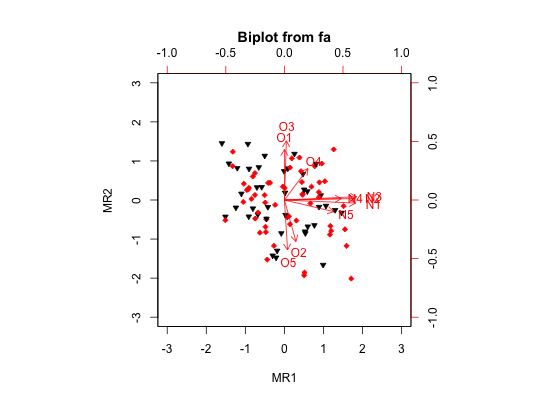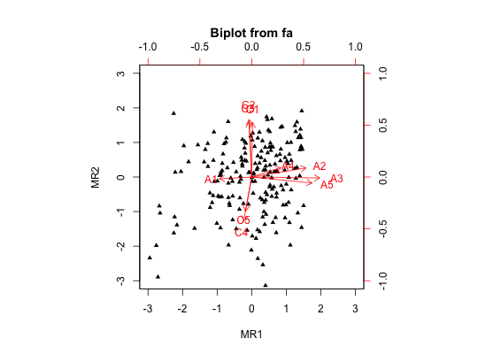 #the standard example data(USArrests) fa2 <- fa(USArrests,2,scores=TRUE) biplot(fa2,labels=rownames(USArrests))#just plot factors 1 and 3 from that solution biplot(fa3,choose=c(1,3))# fa2 <- fa(bfi[16:25],2) #factor analysis fa2$scores <- fa2$scores[1:100,] #just take the first 100 #now plot with different colors and shapes for males and females biplot(fa2,pch=c(24,21)[bfi[1:100,"gender"]],group =bfi[1:100,"gender"], main="Biplot of Conscientiousness and Neuroticism by gender")r <- cor(bfi[1:200,1:10], use="pairwise") #find the correlations f2 <- fa(r,2) x <- list() x$scores <- factor.scores(bfi[1:200,1:10],f2) x$loadings <- f2$loadings class(x) <- c('psych','fa') biplot(x,main="biplot from correlation matrix and factor scores")