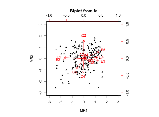 Uses the generic biplot function to take the output of a factor analysis fa, fa.poly or principal components analysis principal and plot the factor/component scores along with the factor/component loadings.