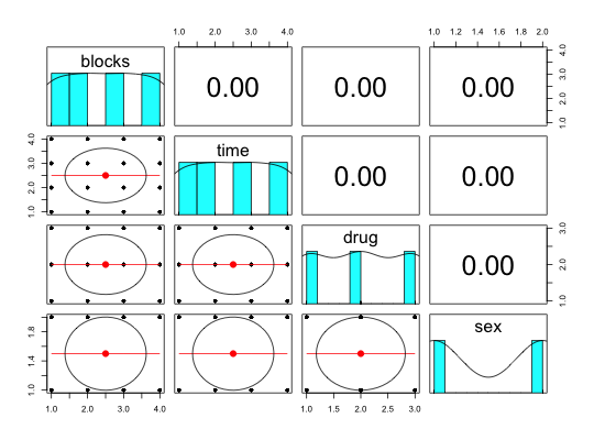 A matrix of subject numbers, block number, and randomized levels for each IV