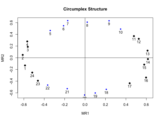``A number of elementary requirements can be teased out of the idea of circumplex structure. First, circumplex structure implies minimally that variables are interrelated; random noise does not a circumplex make. Second, circumplex structure implies that the domain in question is optimally represented by two and only two dimensions. Third, circumplex structure implies that variables do not group or clump along the two axes, as in simple structure, but rather that there are always interstitial variables between any orthogonal pair of axes (Saucier, 1992). In the ideal case, this quality will be reflected in equal spacing of variables along the circumference of the circle (Gurtman, 1994; Wiggins, Steiger, & Gaelick, 1981). Fourth, circumplex structure implies that variables have a constant radius from the center of the circle, which implies that all variables have equal communality on the two circumplex dimensions (Fisher, 1997; Gurtman, 1994). Fifth, circumplex structure implies that all rotations are equally good representations of the domain (Conte & Plutchik, 1981; Larsen & Diener, 1992). (Acton and Revelle, 2004)