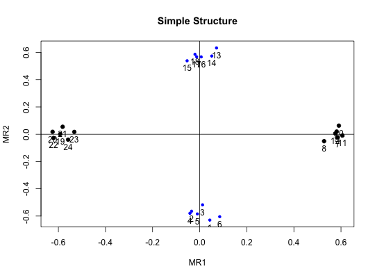 ct <- circ.tests(circ.fa) #compare with non-circumplex data simp.data <- item.sim(24,500) simp.fa <- fa(simp.data,2) plot(simp.fa,title="Simple Structure")st <- circ.tests(simp.fa) res <- rbind(ct[1:4],st[1:4]) rownames(res) <- c("circumplex","Simple") print(res,digits=2)#> gaps fisher RT VT #> circumplex 0.0087 0.1 0.35 0.36 #> Simple 0.27 0.11 0.91 0.88