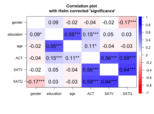 | adjust | If showing significance, should we adjust for multiple tests? The default is to show zero order probabilities below the diagonal and adjust these using the 'holm' correction above the diagonal. Use adjust = "none" if no adjustment is desired. |