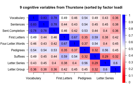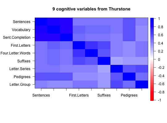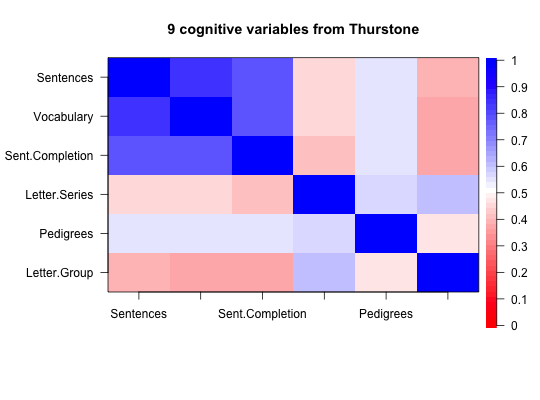 When summarizing the correlations of large data bases or when teaching about factor analysis or cluster analysis, it is useful to graphically display the structure of correlation matrices. This is a simple graphical display using the image function.