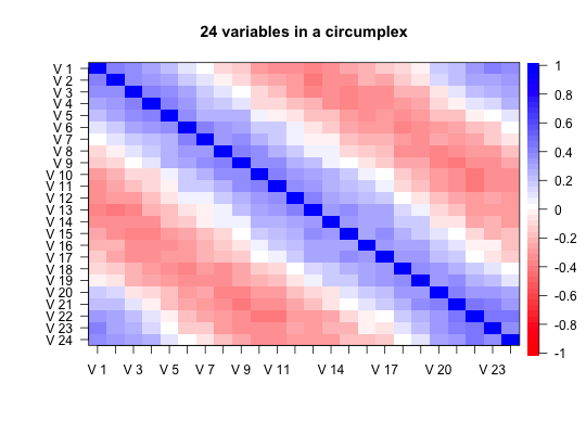 Correlation matrices may be shown graphically by using the image function to emphasize structure. This is a particularly useful tool for showing the structure of correlation matrices with a clear structure. Partially meant for the pedagogical value of the graphic for teaching or discussing factor analysis and other multivariate techniques.