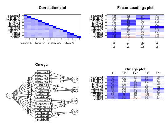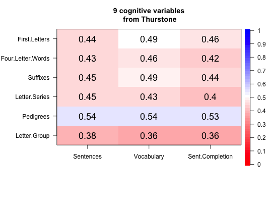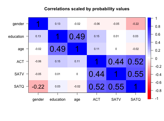 cor.plot(Thurstone,main="9 cognitive variables from Thurstone")#just blue implies positive manifold #select just some variables to plot cor.plot(Thurstone, zlim=c(0,1),main="9 cognitive variables from Thurstone",select=c(1:3,7:9))#now show a non-symmetric plot cor.plot(Thurstone[4:9,1:3], zlim=c(0,1),main="9 cognitive variables from Thurstone",numbers=TRUE,symmetric=FALSE)#Two ways of including stars to show significance #From the raw data corPlot(sat.act,numbers=TRUE,stars=TRUE)#from a correlation matrix with pvals cp <- corr.test(sat.act) #find the correlations and pvals r<- cp$r p <- cp$p corPlot(r,numbers=TRUE,diag=FALSE,stars=TRUE, pval = p,main="Correlation plot with Holm corrected 'significance'")#now red means less than .5 corPlot(mat.sort(Thurstone),TRUE,zlim=c(0,1), main="9 cognitive variables from Thurstone (sorted by factor loading) ")#scale by raw and adjusted probabilities rs <- corr.test(sat.act[1:200,] ) #find the probabilities of the correlations corPlot(r=rs$r,numbers=TRUE,pval=rs$p,main="Correlations scaled by probability values")#Show the upper and lower confidence intervals cor.plot.upperLowerCi(R=rs,numbers=TRUE)#do multiple plots #Also show the xaxis option op <- par(mfrow=c(2,2)) corPlot(ability,show.legend=FALSE,keep.par=FALSE,upper=FALSE) f4 <- fa(ability,4) corPlot(f4,show.legend=FALSE,keep.par=FALSE,numbers=TRUE,xlas=3) om <- omega(ability,4) corPlot(om,show.legend=FALSE,keep.par=FALSE,numbers=TRUE,xaxis=3)par(op)