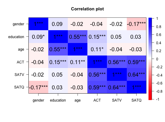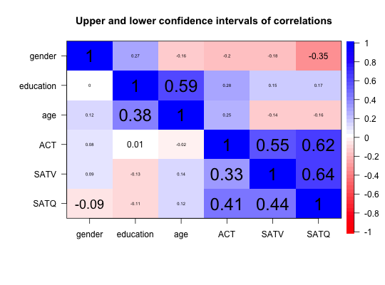 corPlot(r,numbers=FALSE,colors=TRUE,n=51,main=NULL,zlim=c(-1,1), show.legend=TRUE, labels=NULL,n.legend=10,keep.par=TRUE,select=NULL, pval=NULL, cuts=c(.001,.01),scale=TRUE,cex,MAR,upper=TRUE,diag=TRUE, symmetric=TRUE,stars=FALSE, adjust="holm",xaxis=1, xlas=0,ylas=2,...) cor.plot(r,numbers=FALSE,colors=TRUE,n=51,main=NULL,zlim=c(-1,1), show.legend=TRUE, labels=NULL,n.legend=10,keep.par=TRUE,select=NULL, pval=NULL, cuts=c(.001,.01),scale=TRUE,cex,MAR,upper=TRUE,diag=TRUE, symmetric=TRUE,stars=FALSE,adjust="holm",xaxis=1,xlas=0,ylas=2,...) cor.plot.upperLowerCi(R,numbers=TRUE,cuts=c(.001,.01,.05),select=NULL, main="Upper and lower confidence intervals of correlations",...)
