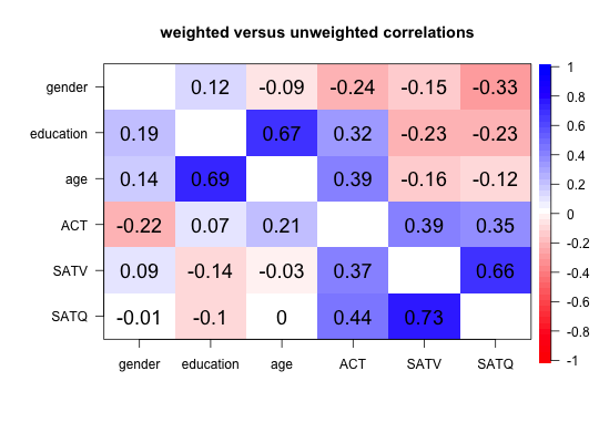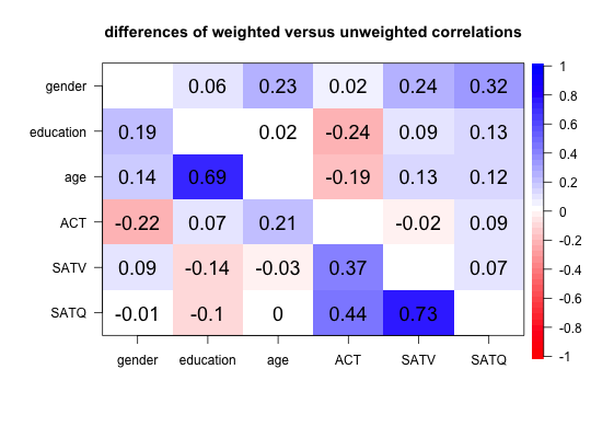 means.by.age <- statsBy(sat.act,"age") wt.cors <- cor.wt(means.by.age) lowerMat(wt.cors$r) #show the weighted correlations#> gendr edctn age ACT SATV SATQ #> gender 1.00 #> education 0.12 1.00 #> age -0.09 0.67 1.00 #> ACT -0.24 0.32 0.39 1.00 #> SATV -0.15 -0.23 -0.16 0.39 1.00 #> SATQ -0.33 -0.23 -0.12 0.35 0.66 1.00#> gendr edctn age ACT SATV SATQ #> gender 1.00 #> education 0.19 1.00 #> age 0.14 0.69 1.00 #> ACT -0.22 0.07 0.21 1.00 #> SATV 0.09 -0.14 -0.03 0.37 1.00 #> SATQ -0.01 -0.10 0.00 0.44 0.73 1.00mixed <- lowerUpper(unwt,wt.cors$r) #combine both results cor.plot(mixed,TRUE,main="weighted versus unweighted correlations")diff <- lowerUpper(unwt,wt.cors$r,TRUE) cor.plot(diff,TRUE,main="differences of weighted versus unweighted correlations")