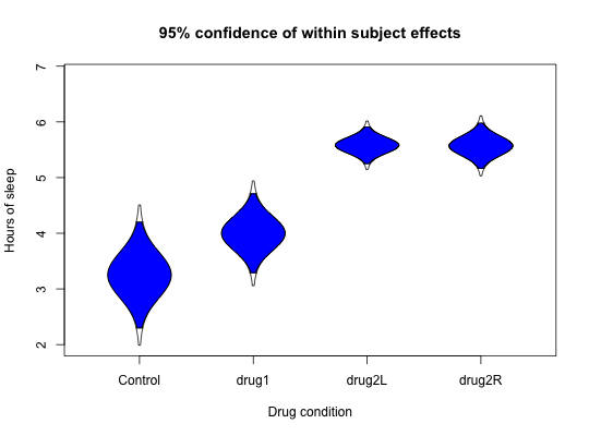 data(cushny) with(cushny, t.test(drug1,drug2L,paired=TRUE)) #within subjects#> #> Paired t-test #> #> data: drug1 and drug2L #> t = -4.0621, df = 9, p-value = 0.002833 #> alternative hypothesis: true difference in means is not equal to 0 #> 95 percent confidence interval: #> -2.4598858 -0.7001142 #> sample estimates: #> mean of the differences #> -1.58 #>error.bars(cushny[1:4],within=TRUE,ylab="Hours of sleep",xlab="Drug condition", main="95% confidence of within subject effects")