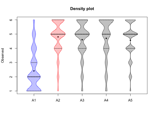 Describe the data using a violin plot. Change density to modify the shading. density=NULL will fill with col. The grp variable may be used to draw separate violin plots for each of multiple groups.