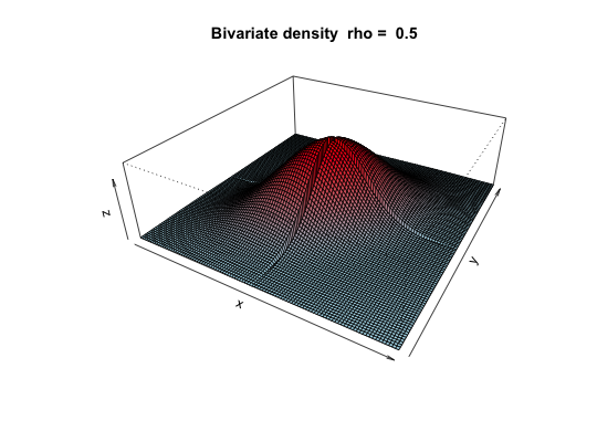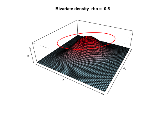 draw.tetra(r, t1, t2,shade=TRUE) draw.cor(r=.5,expand=10,theta=30,phi=30,N=101,nbcol=30,box=TRUE, main="Bivariate density rho = ",cuts=NULL,all=TRUE,ellipses=TRUE,ze=.15)