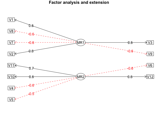 Ro <- Dwyer[1:7,1:7] Roe <- Dwyer[1:7,8] fo <- fa(Ro,2,rotate="none") fe <- fa.extension(Roe,fo) #an example from simulated data set.seed(42) d <- sim.item(12) #two orthogonal factors R <- cor(d) Ro <- R[c(1,2,4,5,7,8,10,11),c(1,2,4,5,7,8,10,11)] Roe <- R[c(1,2,4,5,7,8,10,11),c(3,6,9,12)] fo <- fa(Ro,2) fe <- fa.extension(Roe,fo) fa.diagram(fo,fe=fe)#create two correlated factors fx <- matrix(c(.9,.8,.7,.85,.75,.65,rep(0,12),.9,.8,.7,.85,.75,.65),ncol=2) Phi <- matrix(c(1,.6,.6,1),2) sim.data <- sim.structure(fx,Phi,n=1000,raw=TRUE) R <- cor(sim.data$observed) Ro <- R[c(1,2,4,5,7,8,10,11),c(1,2,4,5,7,8,10,11)] Roe <- R[c(1,2,4,5,7,8,10,11),c(3,6,9,12)] fo <- fa(Ro,2) fe <- fa.extension(Roe,fo) fa.diagram(fo,fe=fe)#now show how fa.extend works with the same data set #note that we have to make sure that the variables are in the order to do the factor congruence fe2 <- fa.extend(R,2,ov=c(1,2,4,5,7,8,10,11),ev=c(3,6,9,12),n.obs=1000) fa.diagram(fe2,main="factor analysis with extension variables")#> MR1 MR2 #> MR1 1.00 0 #> MR2 0.01 1summary(fe2) #an example of extending an omega analysis fload <- matrix(c(c(c(.9,.8,.7,.6),rep(0,20)),c(c(.9,.8,.7,.6),rep(0,20)),c(c(.9,.8,.7,.6), rep(0,20)),c(c(c(.9,.8,.7,.6),rep(0,20)),c(.9,.8,.7,.6))),ncol=5) gload <- matrix(rep(.7,5)) five.factor <- sim.hierarchical(gload,fload,500,TRUE) #create sample data set ss <- c(1,2,3,5,6,7,9,10,11,13,14,15,17,18,19) Ro <- cor(five.factor$observed[,ss]) Re <- cor(five.factor$observed[,ss],five.factor$observed[,-ss]) om5 <-omega(Ro,5) #the omega analysisfa.extension(Re,om5) #the extension analysis#> #> Call: fa.extension(Roe = Re, fo = om5) #> Standardized loadings (pattern matrix) based upon correlation matrix #> g F1* F2* F3* F4* F5* h2 u2 #> V4 0.38 0.07 0.02 0.34 0.03 -0.01 0.27 0.73 #> V8 0.43 0.00 0.07 -0.03 0.36 0.05 0.32 0.68 #> V12 0.38 0.41 0.04 -0.02 0.01 0.03 0.31 0.69 #> V16 0.39 -0.02 -0.01 0.02 -0.01 0.36 0.28 0.72 #> V20 0.38 -0.03 0.34 0.07 0.01 0.01 0.27 0.73 #> #> g F1* F2* F3* F4* F5* #> SS loadings 0.77 0.17 0.12 0.12 0.13 0.13 #> Proportion Var 0.15 0.03 0.02 0.02 0.03 0.03 #> Cumulative Var 0.15 0.19 0.21 0.24 0.26 0.29 #> Proportion Explained 0.53 0.12 0.09 0.09 0.09 0.09 #> Cumulative Proportion 0.53 0.65 0.73 0.82 0.91 1.00