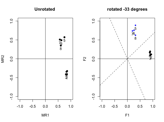 Partly meant as a demonstration of how rotation works, factor.rotate is useful for those cases that require specific rotations that are not available in more advanced packages such as GPArotation. If the plot option is set to TRUE, then the original axes are shown as dashed lines.