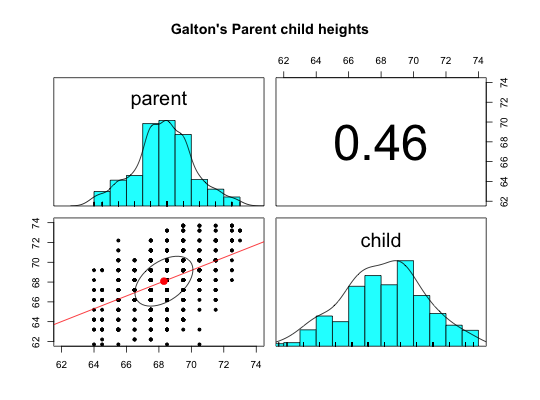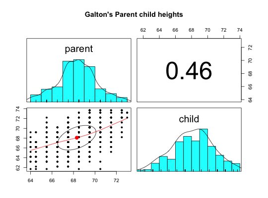 #> vars n mean sd median trimmed mad min max range skew kurtosis #> parent 1 928 68.31 1.79 68.5 68.32 1.48 64.0 73.0 9 -0.04 0.05 #> child 2 928 68.09 2.52 68.2 68.12 2.97 61.7 73.7 12 -0.09 -0.35 #> se #> parent 0.06 #> child 0.08#but this makes the regression lines look the same pairs.panels(galton,lm=TRUE,main="Galton's Parent child heights")#better is to scale them pairs.panels(galton,lm=TRUE,xlim=c(62,74),ylim=c(62,74),main="Galton's Parent child heights")