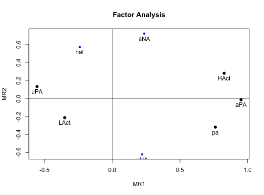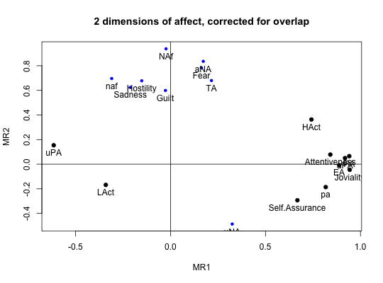 data(msq) if(FALSE){ #not run in the interests of time #basic descriptive statistics describe(msq) } #score them for 20 short scales -- note that these have item overlap #The first 2 are from Thayer #The next 2 are classic positive and negative affect #The next 9 are circumplex scales #the last 7 are msq estimates of PANASX scales (missing some items) keys <- make.keys(msq[1:75],list( EA = c("active", "energetic", "vigorous", "wakeful", "wide.awake", "full.of.pep", "lively", "-sleepy", "-tired", "-drowsy"), TA =c("intense", "jittery", "fearful", "tense", "clutched.up", "-quiet", "-still", "-placid", "-calm", "-at.rest") , PA =c("active", "excited", "strong", "inspired", "determined", "attentive", "interested", "enthusiastic", "proud", "alert"), NAf =c("jittery", "nervous", "scared", "afraid", "guilty", "ashamed", "distressed", "upset", "hostile", "irritable" ), HAct = c("active", "aroused", "surprised", "intense", "astonished"), aPA = c("elated", "excited", "enthusiastic", "lively"), uNA = c("calm", "serene", "relaxed", "at.rest", "content", "at.ease"), pa = c("happy", "warmhearted", "pleased", "cheerful", "delighted" ), LAct = c("quiet", "inactive", "idle", "still", "tranquil"), uPA =c( "dull", "bored", "sluggish", "tired", "drowsy"), naf = c( "sad", "blue", "unhappy", "gloomy", "grouchy"), aNA = c("jittery", "anxious", "nervous", "fearful", "distressed"), Fear = c("afraid" , "scared" , "nervous" , "jittery" ) , Hostility = c("angry" , "hostile", "irritable", "scornful" ), Guilt = c("guilty" , "ashamed" ), Sadness = c( "sad" , "blue" , "lonely", "alone" ), Joviality =c("happy","delighted", "cheerful", "excited", "enthusiastic", "lively", "energetic"), Self.Assurance=c( "proud","strong" , "confident" , "-fearful" ), Attentiveness = c("alert" , "determined" , "attentive" ) #acquiscence = c("sleepy" , "wakeful" , "relaxed","tense") )) msq.scores <- scoreItems(keys,msq[1:75]) #show a circumplex structure for the non-overlapping items fcirc <- fa(msq.scores$scores[,5:12],2) fa.plot(fcirc,labels=colnames(msq.scores$scores)[5:12])#> Warning: Missing values (NAs) in the correlation matrix do not allow for SMC's to be found for all variables. #> I will try to estimate SMCs for those variables by their non-NA correlations.#> #> SMC(s) for variables alone kindly scornful were replaced (if possible) with smcs based upon their (its) non-NA correlationsf2 <- fa(msq.overlap$cor,2) fa.plot(f2,labels=colnames(msq.overlap$cor),title="2 dimensions of affect, corrected for overlap")if(FALSE) { #extend this solution to EA/TA NA/PA space fe <- fa.extension(cor(msq.scores$scores[,5:12],msq.scores$scores[,1:4]),fcirc) fa.diagram(fcirc,fe=fe,main="Extending the circumplex structure to EA/TA and PA/NA ") #show the 2 dimensional structure f2 <- fa(msq[1:72],2) fa.plot(f2,labels=colnames(msq)[1:72],title="2 dimensions of affect at the item level") #sort them by polar coordinates round(polar(f2),2) }