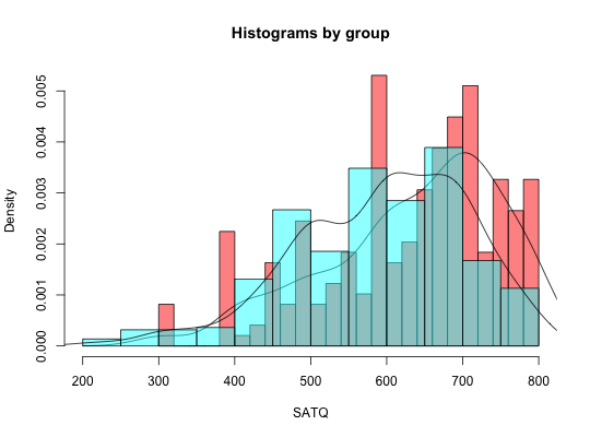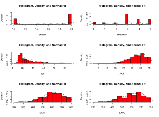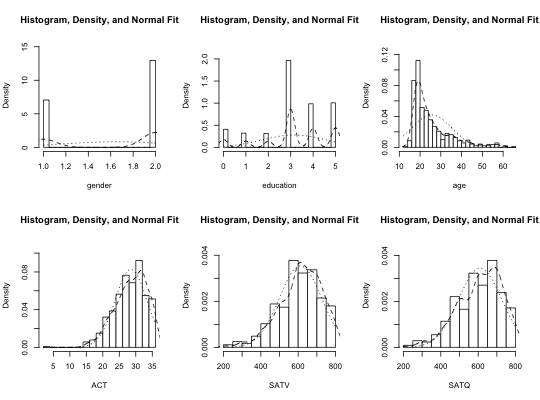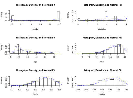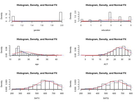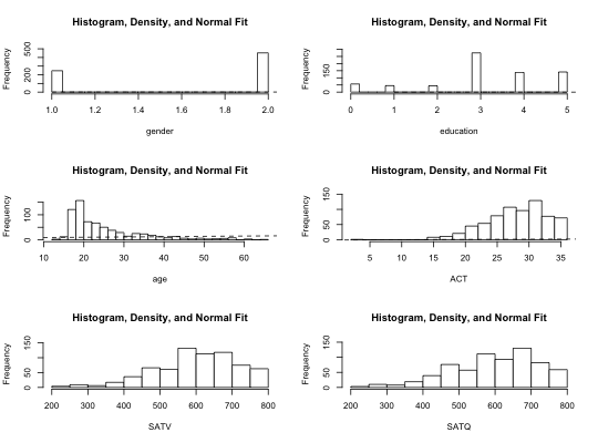 multi.hist(sat.act)multi.hist(sat.act,bcol="red")multi.hist(sat.act,dcol="blue") #make both lines bluemulti.hist(sat.act,dcol= c("blue","red"),dlty=c("dotted", "solid"))multi.hist(sat.act,freq=TRUE) #show the frequency plotmulti.hist(sat.act,nrow=2)histBy(sat.act,"SATQ","gender")
