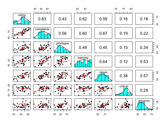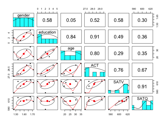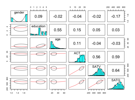 pairs.panels(attitude) #see the graphics windowdata(iris) pairs.panels(iris[1:4],bg=c("red","yellow","blue")[iris$Species], pch=21,main="Fisher Iris data by Species") #to show color groupingpairs.panels(iris[1:4],bg=c("red","yellow","blue")[iris$Species], pch=21+as.numeric(iris$Species),main="Fisher Iris data by Species",hist.col="red")#to show changing the diagonal #to show 'significance' pairs.panels(iris[1:4],bg=c("red","yellow","blue")[iris$Species], pch=21+as.numeric(iris$Species),main="Fisher Iris data by Species",hist.col="red",stars=TRUE)#demonstrate not showing the data points data(sat.act) pairs.panels(sat.act,show.points=FALSE)#better yet is to show the points as a period pairs.panels(sat.act,pch=".")#show many variables with 0 gap between scatterplots # data(bfi) # pairs.panels(bfi,show.points=FALSE,gap=0) #plot raw data points and then the weighted correlations. #output from statsBy sb <- statsBy(sat.act,"education") pairs.panels(sb$mean,wt=sb$n) #report the weighted correlations#compare with pairs.panels(sb$mean) #unweighed correlations