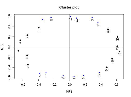 circ.data <- circ.sim(24,500) circ.fa <- fa(circ.data,2) circ.polar <- round(polar(circ.fa),2) circ.polar#> Var theta21 vecl21 #> v17 17 1.44 0.37 #> v16 16 17.57 0.41 #> v15 15 35.01 0.36 #> v14 14 52.40 0.35 #> v13 13 63.21 0.41 #> v12 12 81.04 0.32 #> v11 11 88.96 0.35 #> v10 10 112.63 0.38 #> v9 9 123.12 0.41 #> v8 8 136.61 0.30 #> v7 7 157.14 0.35 #> v6 6 168.41 0.42 #> v5 5 186.56 0.44 #> v4 4 196.53 0.32 #> v3 3 212.73 0.41 #> v2 2 233.27 0.41 #> v1 1 239.03 0.35 #> v24 24 261.44 0.32 #> v23 23 275.55 0.34 #> v22 22 287.99 0.34 #> v21 21 307.16 0.39 #> v20 20 320.24 0.38 #> v19 19 336.84 0.35 #> v18 18 352.19 0.42