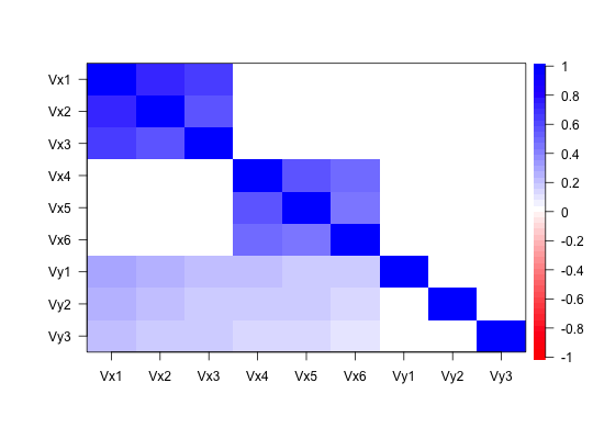simplex <- sim.simplex() #create the default simplex structure lowerMat(simplex) #the correlation matrix#> V1 V2 V3 V4 V5 V6 V7 V8 V9 V10 V11 #> V1 1.00 #> V2 0.80 1.00 #> V3 0.64 0.80 1.00 #> V4 0.51 0.64 0.80 1.00 #> V5 0.41 0.51 0.64 0.80 1.00 #> V6 0.33 0.41 0.51 0.64 0.80 1.00 #> V7 0.26 0.33 0.41 0.51 0.64 0.80 1.00 #> V8 0.21 0.26 0.33 0.41 0.51 0.64 0.80 1.00 #> V9 0.17 0.21 0.26 0.33 0.41 0.51 0.64 0.80 1.00 #> V10 0.13 0.17 0.21 0.26 0.33 0.41 0.51 0.64 0.80 1.00 #> V11 0.11 0.13 0.17 0.21 0.26 0.33 0.41 0.51 0.64 0.80 1.00 #> V12 0.09 0.11 0.13 0.17 0.21 0.26 0.33 0.41 0.51 0.64 0.80 #> [1] 1.00#> V1 V2 V3 V4 #> V1 1.00 #> V2 0.56 1.00 #> V3 0.48 0.42 1.00 #> V4 0.40 0.35 0.30 1.00#> V1 V2 V3 V4 V5 V6 V7 V8 V9 #> V1 1.00 #> V2 0.56 1.00 #> V3 0.48 0.42 1.00 #> V4 0.40 0.35 0.30 1.00 #> V5 0.35 0.30 0.26 0.42 1.00 #> V6 0.29 0.25 0.22 0.35 0.30 1.00 #> V7 0.30 0.26 0.23 0.24 0.20 0.17 1.00 #> V8 0.25 0.22 0.19 0.20 0.17 0.14 0.30 1.00 #> V9 0.20 0.18 0.15 0.16 0.13 0.11 0.24 0.20 1.00#now simulate categorical items with the hierarchical factor structure. #Let the items be dichotomous with varying item difficulties. marginals = matrix(c(seq(.1,.9,.1),seq(.9,.1,-.1)),byrow=TRUE,nrow=2) X <- sim.poly.mat(R=R,m=marginals,n=1000) lowerCor(X) #show the raw correlations#> C1 C2 C3 C4 C5 C6 C7 C8 C9 #> R1 1.00 #> R2 0.37 1.00 #> R3 0.39 0.27 1.00 #> R4 0.22 0.30 0.15 1.00 #> R5 0.21 0.20 0.18 0.22 1.00 #> R6 0.15 0.21 0.11 0.28 0.11 1.00 #> R7 0.24 0.12 0.18 0.10 0.14 0.06 1.00 #> R8 0.15 0.20 0.08 0.14 0.08 0.09 0.17 1.00 #> R9 0.17 0.12 0.17 0.13 0.17 0.07 0.21 0.14 1.00#lowerMat(tetrachoric(X)$rho) # show the tetrachoric correlations (not run) #generate a structure fx <- matrix(c(.9,.8,.7,rep(0,6),c(.8,.7,.6)),ncol=2) fy <- c(.6,.5,.4) Phi <- matrix(c(1,0,.5,0,1,.4,0,0,0),ncol=3) R <- sim.structure(fx,Phi,fy) cor.plot(R$model) #show it graphicallysimp <- sim.simplex() #show the simplex structure using cor.plot cor.plot(simp,colors=TRUE,main="A simplex structure")#Show a STARS model simp <- sim.simplex(alpha=.8,lambda=.4) #show the simplex structure using cor.plot cor.plot(simp,colors=TRUE,main="State Trait Auto Regressive Simplex" )