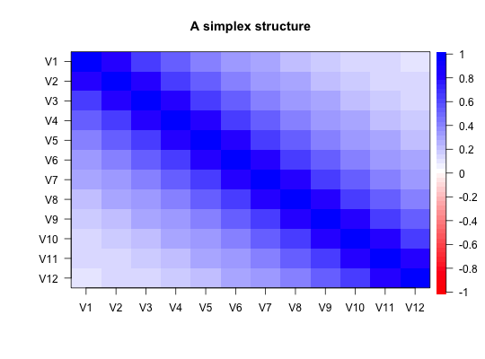 Two data structures that are particular challenges to exploratory factor analysis are the simplex structure and the presence of minor factors. Simplex structures sim.simplex will typically occur in developmental or learning contexts and have a correlation structure of r between adjacent variables and r^n for variables n apart. Although just one latent variable (r) needs to be estimated, the structure will have nvar-1 factors.