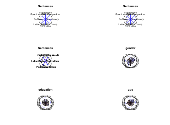 op <- par(mfrow=c(3,2)) spider(y=1,x=2:9,data=Thurstone,connect=FALSE) #a radar plot spider(y=1,x=2:9,data=Thurstone) #same plot as a spider plot spider(y=1:3,x=4:9,data=Thurstone,overlay=TRUE) #make a somewhat oversized plot spider(y=26:28,x=1:25,data=cor(bfi,use="pairwise"),fill=TRUE,scale=2)par(op)