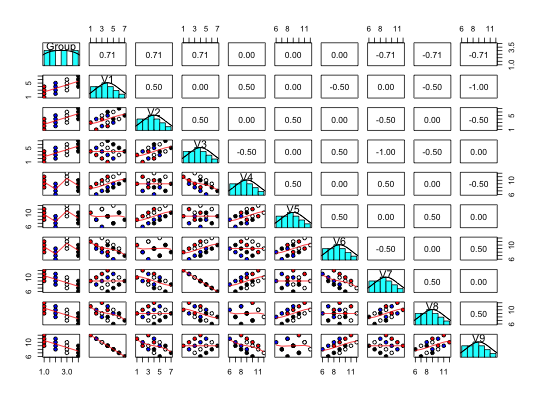 data(withinBetween) pairs.panels(withinBetween,bg=c("red","blue","white","black")[withinBetween[,1]], pch=21,ellipses=FALSE)#> Statistics within and between groups #> Call: statsBy(data = withinBetween, group = "Group") #> Intraclass Correlation 1 (Percentage of variance due to groups) #> Group V1 V2 V3 V4 V5 V6 V7 V8 V9 #> 1.00 0.43 0.43 0.43 0.43 0.43 0.43 0.43 0.43 0.43 #> Intraclass Correlation 2 (Reliability of group differences) #> Group V1 V2 V3 V4 V5 V6 V7 V8 V9 #> 1.00 0.75 0.75 0.75 0.75 0.75 0.75 0.75 0.75 0.75 #> eta^2 between groups #> V1.bg V2.bg V3.bg V4.bg V5.bg V6.bg V7.bg V8.bg V9.bg #> 0.5 0.5 0.5 0.5 0.5 0.5 0.5 0.5 0.5 #> Correlation between groups #> V1.bg V2.bg V3.bg V4.bg V5.bg V6.bg V7.bg V8.bg V9.bg #> V1.bg 1 #> V2.bg 1 1 #> V3.bg 1 1 1 #> V4.bg 0 0 0 1 #> V5.bg 0 0 0 1 1 #> V6.bg 0 0 0 1 1 1 #> V7.bg -1 -1 -1 0 0 0 1 #> V8.bg -1 -1 -1 0 0 0 1 1 #> V9.bg -1 -1 -1 0 0 0 1 1 1 #> Correlation within groups #> V1.wg V2.wg V3.wg V4.wg V5.wg V6.wg V7.wg V8.wg V9.wg #> V1.wg 1 #> V2.wg 0 1 #> V3.wg -1 0 1 #> V4.wg 1 0 -1 1 #> V5.wg 0 1 0 0 1 #> V6.wg -1 0 1 -1 0 1 #> V7.wg 1 0 -1 1 0 -1 1 #> V8.wg 0 1 0 0 1 0 0 1 #> V9.wg -1 0 1 -1 0 1 -1 0 1 #> #> Many results are not shown directly. To see specific objects select from the following list: #> mean sd n F ICC1 ICC2 ci1 ci2 raw rbg pbg rwg nw pwg etabg etawg nwg nG Call